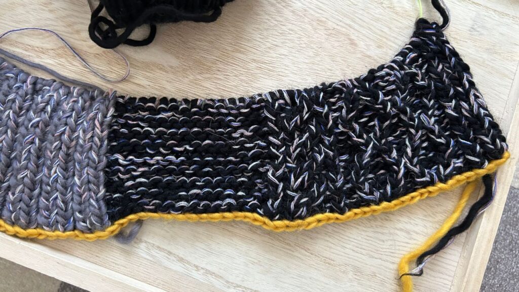 二目ゴム編みが内側になるけど編み図どおりの二目ゴム編みで色を変えたら、実際に着用したときに裏(内側)の色が見えてしまうから、二目ゴム編みの2目を編み初めにもってきて表に出る方の色で編むといいかも
